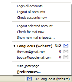 This is a Firefox extension that allows you to manage multiple Gmail accounts and receive new mail notifications. Displays account details including unread messages, saved drafts, spam messages, labels with new mail, space used, and new mail snippets.